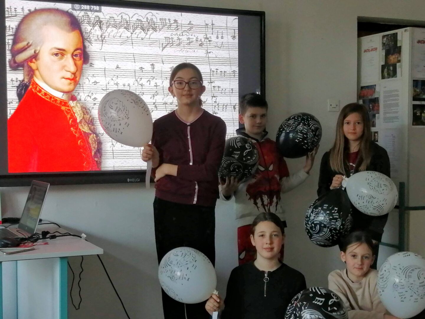 Kroz zanimljive aktivnosti učenici su imali priliku upoznati život i djelo ovog iznimnog glazbenog genija. Radionica je započela slušanjem 1. stavka Male noćne muzike pri čemu su učenici iznosili svoje dojmove te prepoznavali instrumente, ugođaj i tempo skladbe. Uz slušanje glazbe, učenici su se i sami okušali u muziciranju izvodeći ritam skladbe na različitim udaraljkama čime su na kreativan način doživjeli duh stvaranja glazbe i izvedbe glazbenog djela. Kao na svakoj dobroj proslavi rođendana, i u našoj učionici našli su se baloni. Na njima su učenici pronašli zanimljivosti o životu i radu skladatelja koje smo pročitali i zajednički komentirali. Učenike je posebno oduševila činjenica da je Mozart već kao dijete pokazivao izvanredan glazbeni talent te količina glazbenih djela koje je uspio skladati za tako kratkoga života.